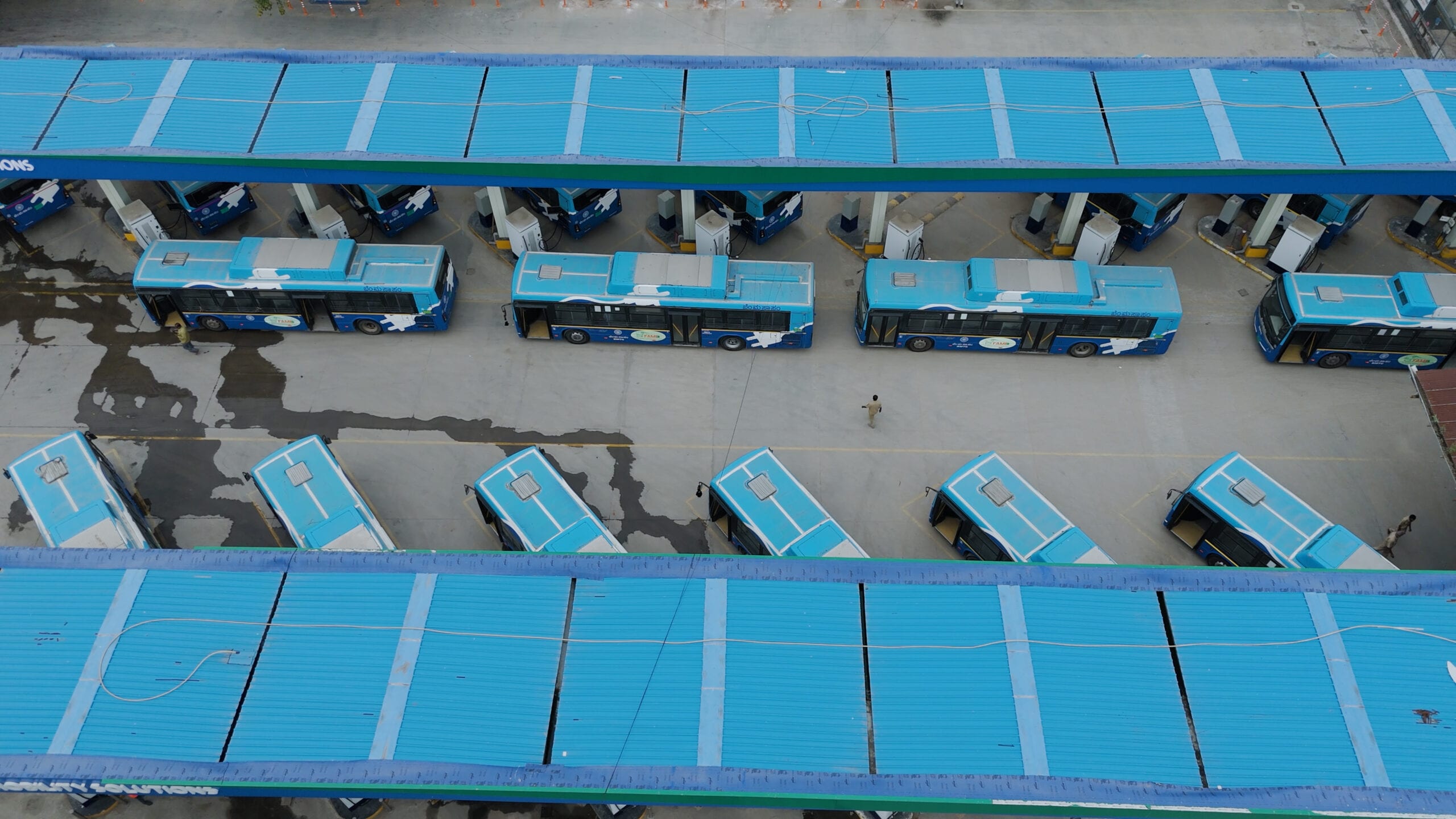 Electric buses being charged at the Shanti Nagar Electric Bus Depot, Bengaluru