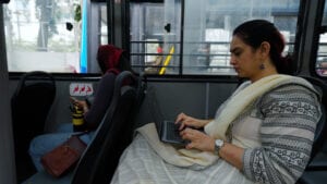 commitments during her commute in an electric bus.
