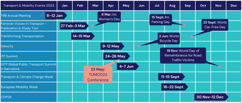 As every year, there are numerous transport and mobility events taking place in 2023 that you should not miss. From Transforming Transportation to this year´s TUMI conference and COP28, here’s an overview of the most important transport and mobility events coming up in 2023. Mark your calendars and join us, in person or virtually!