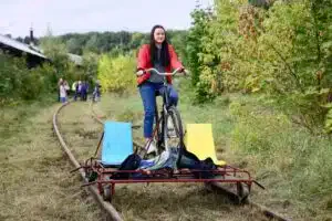 An extraordinary draisine excursion to explore one of now non-functional railway tracks in a very green city part Lychakiv not far away from the city center. This green connection now has a slide different function as it used to have, the leisure one.