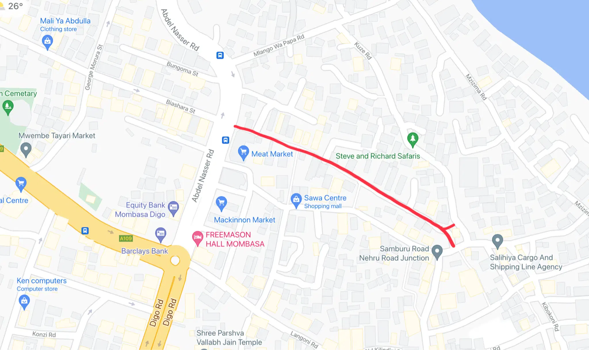 Image: The study area consists of Biashara St (-4.0572483576721625, 39.67396169003667), from Abdel Nasser Road to Nehru Rd, a length of approximately 300 m.