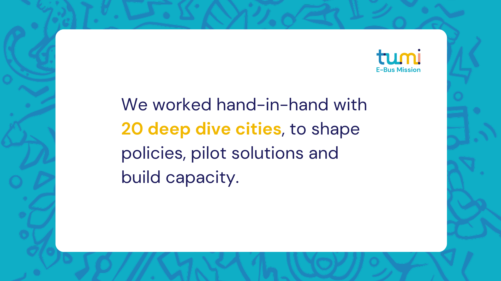 From 2021 to 2025, the TUMI E-Bus Mission led an unprecedented effort to build coalitions at global and local levels, working closely with 20 Deep Dive Cities and inspiring commitments in 100 more. Through roadmaps, technical assistance, and knowledge sharing, the Mission empowered cities to develop e-bus fleets tailored to their needs. By uniting public and private sector partners, it laid the groundwork for a lasting community driving the shift toward cleaner, greener, and more livable urban transport worldwide.