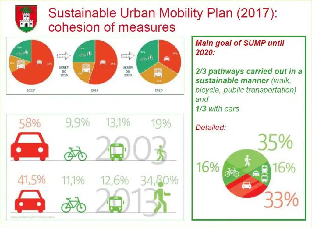 The main objective of the SUMP until 2020 in Ljubljana is for two-thirds of its citizens’ pathways to be carried out in a sustainable manner (walk, bicycle, public transportation) and one-third by cars.