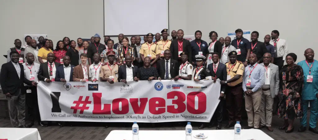 Participants calling for 30 km/h as default speed on urban roads in Nigeria, including the Honourable Commissioner for Transport (“e3” on the banner´s inscription) and the Managing Director of LAMATA (“ve” of the inscription)